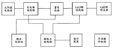 太陽能路燈微機監(jiān)控系統(tǒng)由微機主控線路、太陽能電池板、蓄電池充放電器、蓄電池組、LED光源驅(qū)動和LED燈等幾部分組成。系統(tǒng)組成結(jié)構(gòu)如圖1所示: