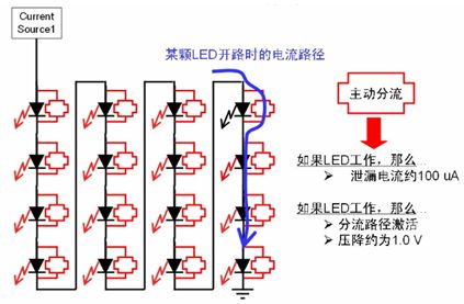 區(qū)域照明應(yīng)用中通常會采用多串LED,雖然LED本身可靠性高,但若LED串中的某個LED開路,那么整串LED就可能關(guān)閉,而街道照明等應(yīng)用中必須避免這種狀況,從而降低后期維護(hù)成本。為了增強(qiáng)LED串的可靠性,這種安森美半導(dǎo)體推出了NUD4700 LED電流旁路保護(hù)器。NUD4700器件是一款分流器件,當(dāng)LED串中某個LED開路時,就會提供電流旁路,確保整串LED不會關(guān)閉;而且恰當(dāng)處理散熱的話,還可支持大于1 A的大電流,其工作原理如圖8所示。