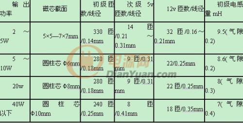 制作RCC型電源關(guān)鍵是脈沖變壓器T的繞制。無(wú)論何種開(kāi)關(guān)電源脈沖變壓器的計(jì)算是極繁瑣又極不準(zhǔn)確的,對(duì)業(yè)余制作者來(lái)說(shuō)通過(guò)估算,實(shí)驗(yàn)調(diào)整來(lái)確定比較實(shí)際。即使是估算也涉及磁芯材料,結(jié)構(gòu)的影響,限于目前市場(chǎng)產(chǎn)品參數(shù)的離散性,業(yè)余者也難以確定,此處只列出部分計(jì)算結(jié)果供參考。小功率開(kāi)關(guān)電源脈沖變壓器制作參數(shù)(繞組功能參考附圖)如附表所示。