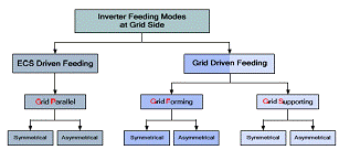 在ECS驅(qū)動(dòng)饋電時(shí),ECS決定了向電網(wǎng)傳輸?shù)墓β?。如今,單臺(tái)RESs逆變器典型地就在這種饋電方式下運(yùn)行,并向電網(wǎng)注入全部可提供的功率。在電網(wǎng)驅(qū)動(dòng)饋電時(shí),不再是ECS,而是電網(wǎng)決定功率的傳輸。典型的,大多數(shù)常規(guī)大型電廠運(yùn)行在這種方式下,同樣,這種方式潛在的適合DERs和RESs系統(tǒng),或者至少適合混合式電力系統(tǒng)。在ECS驅(qū)動(dòng)饋電的情況下,逆變器控制方式被稱作電網(wǎng)平行方式。第二種情況可以被兩種不同的逆變器控制方式實(shí)現(xiàn),分別是電網(wǎng)形成方式和電網(wǎng)支持方式。電網(wǎng)形成方式中逆變器的作用是建立和維持電網(wǎng)狀態(tài)變量。電網(wǎng)支持方式中逆變器被用于平衡功率。它可以傳輸預(yù)先設(shè)定數(shù)量的功率,這個(gè)數(shù)量可以根據(jù)電力系統(tǒng)的需要或者高級(jí)控制運(yùn)行得到的參考值進(jìn)行調(diào)整。應(yīng)用這個(gè)控制方式的逆變器例子如圖3至圖5的左側(cè)所示。此外,這些基本有功功率調(diào)控器潛在的對(duì)二次電網(wǎng)控制的相互聯(lián)系可以被類似的闡釋。