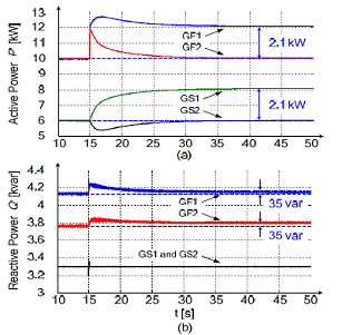 圖7描述了逆變器的有功功率。最初,每個(gè)電網(wǎng)形成方式的逆變器都提供10kW功率,電網(wǎng)支持方式的逆變器都提供6kW功率。于是,兩個(gè)電網(wǎng)形成方式的逆變器和兩個(gè)電網(wǎng)支持方式的逆變器平均分?jǐn)傌?fù)載功率。15s時(shí),4.2kW的負(fù)載階躍功率被加到第一個(gè)電網(wǎng)上。隨著負(fù)載改變,所有的逆變器都馬上做出了反應(yīng),功率的產(chǎn)生和消耗被重新分配。