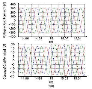 第一個(gè)電網(wǎng)形成方式的逆變器在連接點(diǎn)處的電壓和電流如圖9所示。逆變器電壓幾乎不受干擾,與此同時(shí),只有電流去適應(yīng)相關(guān)負(fù)載情況。