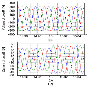 圖10 (a) t=15s時(shí)加入階躍負(fù)載的負(fù)載三相電壓 (b) t=15s時(shí)加入階躍負(fù)載的負(fù)載三相電流