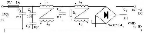 采用無(wú)源的EMI濾波器是抑制傳導(dǎo)干擾最有效的辦法。即在電路中插入一個(gè)帶通濾波器,讓50 Hz交流電暢通,其余頻率的信號(hào)受阻。但要嚴(yán)格控制濾波器LC元件的寄生參數(shù),它們的制作工藝、安裝位置、走線方式,都會(huì)影響EMI濾波效果。加接圖1所示的濾波電路,可以控制通過(guò)傳導(dǎo)耦合進(jìn)入電網(wǎng)的噪聲電平。