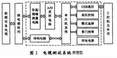 電纜測試系統(tǒng)主要由工控機系統(tǒng),單片機系統(tǒng)和繼電器陣列三部分構(gòu)成。其中工控機負責(zé)人機交互和數(shù)據(jù)處理,單片機系統(tǒng)控制硬件電路完成相應(yīng)動作,繼電器陣列負責(zé)響應(yīng)譯碼電路的請求將外部電纜接入測試系統(tǒng)。單片機和工控機通過USB進行通信。如圖1所示。
