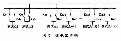 繼電器陣列由3168個繼電器實現(xiàn)了1536個測試點之間的導(dǎo)通/絕緣測試和繼電器組之間的隔離。1 536個測試點分布在12塊單板上面,每塊單板上面有128個測試點,單板內(nèi)又分為16行,每行8列,即12×16×8=1 536。每一個測試點由兩個繼電器控制,分別是輸入繼電器(Kat)和輸出繼電器(Kab)。每塊單板對應(yīng)外部的一個128芯的航空插頭,負責(zé)和被測產(chǎn)品的連接。其原理如圖2所示。
