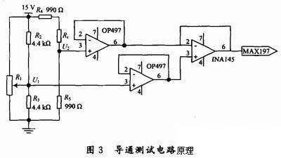 由于導(dǎo)通電阻很小,一般為歐姆級,容易受到外界干擾的影響,惠斯登電橋的兩臂同時對電源的微小變化做出反應(yīng),將輸出信號送入差分放大器,從而消除了共模干擾,可以提高測試的準(zhǔn)確性。其原理如圖3所示。