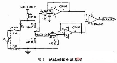 對于絕緣測試電路而言,由于輸入測試電壓為500~1 000 V,對干擾不太敏感,所以絕緣測試電路采用相對簡單的電阻分壓法來實現(xiàn)。