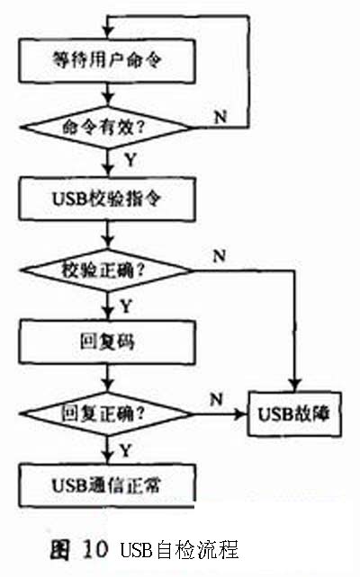 為了保證設(shè)備本身的工作正常,電纜測試系統(tǒng)提供自檢功能。自檢流程分為兩部分,第一部分對USB通道進行自檢,USB自檢流程如圖10所示。系統(tǒng)上電后,工控機發(fā)送校驗指令,單片機判斷校驗碼是否正確,在校驗碼正確的情況下,按照協(xié)議返回復(fù)碼,工控機判斷回復(fù)碼正確的情況下,USB通信建立正常。第二部分是對繼電器陣列進行自檢,其流程與導(dǎo)通測試類似。以測試點1和測試點2為例,首先,閉合測試點1的輸入繼電器,采樣測試電壓,如果系統(tǒng)判斷為斷開,則可以說明測試點1的輸出繼電器沒有常閉,反之則說明為常閉故障。把測試點1的輸入繼電器更換為輸出繼電器,采用同樣的方法可以判斷出測試點1的輸入繼電器是否為常閉故障。其次,分別打開測試點1的輸入和輸出繼電器,如果系統(tǒng)判斷為導(dǎo)通,在第一步的基礎(chǔ)上就可以說明兩個繼電器均正常;如果系統(tǒng)判斷為斷開,則兩個繼電器中至少有一個為常開故障。最后,在外部端口上接入自檢插頭,分別選擇測試點1的輸入繼電器和測試點2的輸出繼電器,如果系統(tǒng)判斷為導(dǎo)通,則可以說明內(nèi)部繼電器和單板到端口的引線正常,反之則說明繼電器到測試端的引線出現(xiàn)問題。