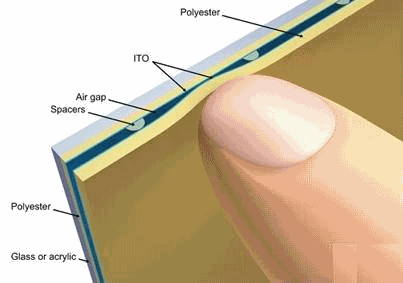 電阻式觸控屏幕已擺脫從1970年代就存在的專利限制桎梏,這種技術(shù)的工作原理很簡(jiǎn)單,主要部分是由兩層微小空氣隙隔離的透明電阻材料組成,一般是淀積在塑料膜和玻璃基板上的氧化銦錫(ITO),其中,頂層是軟性的(Flexible),而低層是硬性的(Rigid),中間有許多細(xì)小的透明間隔點(diǎn)以隔離兩個(gè)導(dǎo)電層(圖1),當(dāng)用戶手指按壓頂層時(shí),在接觸點(diǎn)形成電壓梯度時(shí),電子控制組件會(huì)對(duì)之進(jìn)行感測(cè),并計(jì)算出X、Y坐標(biāo)的位置。