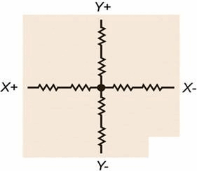 在最簡(jiǎn)單的四線(Four-wire)電阻式連接中,頂層兩端和低層兩端分別各連接兩個(gè)電極,兩層的電極互相呈九十度交叉,形成四線星狀連接結(jié)構(gòu),這實(shí)際上就是一對(duì)彼此正交的電位計(jì)(圖2),相當(dāng)于機(jī)械操縱桿的平面屏幕模擬。為了在X軸方向測(cè)量觸摸位置,觸控板的控制器將X-設(shè)為接地,而X+偏置為參考電壓,然后從Y層的兩端讀取電壓,以找出X軸上兩層的接觸點(diǎn)。同樣地,控制器透過(guò)在Y層的電極上加載驅(qū)動(dòng)電壓,并從X層讀取觸摸點(diǎn)電壓,可以確定Y軸上的觸摸位置。