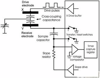 RC時(shí)間常數(shù)技術(shù)的基本原理是,當(dāng)電容組件C隨手指觸摸改變時(shí),電極區(qū)域充電或放電所需的時(shí)間也隨之改變。測(cè)量充/放電期間的變化可得到C的變化,因?yàn)镃是未知,所以假設(shè)為Cx,這種方法有許多變化形式,可測(cè)量頻率或時(shí)間、可自由運(yùn)行或以單周期為基礎(chǔ)。RC時(shí)間常數(shù)測(cè)量的缺點(diǎn)是速度較慢,并易受泄漏電流干擾,其動(dòng)態(tài)范圍也非常有限,很難校準(zhǔn),而且容易受到恒定漂移問(wèn)題的影響。此外,由于其電路的高阻抗特性,所以也極易受外界噪聲干擾,盡管如此,仍有部分觸控屏幕采用這種方案。