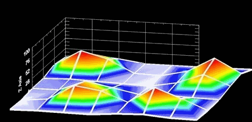 利用單層膜同步執(zhí)行雙觸點(diǎn)檢測(cè)也是可行的,但若采用能夠同時(shí)解決多觸點(diǎn)事件的雙層技術(shù),性能便會(huì)好得多。如圖7顯示在一個(gè)實(shí)驗(yàn)室測(cè)試模型中使用者用三根指頭和大拇指時(shí),電場(chǎng)的三維測(cè)量結(jié)果。