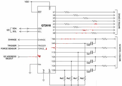 透過(guò)連接一個(gè)放在六電極Y層上的八電極X層,控制器可支持大至8寸的雙觸控屏幕,而且這種多功能控制器能感測(cè)多達(dá)六個(gè)滑塊或四十八個(gè)離散式按鍵,或按鍵、滑塊與觸摸區(qū)域的組合,該控制器為接腳數(shù)精簡(jiǎn)的版本,利用類似的簡(jiǎn)單布線圖(圖8),能夠驅(qū)動(dòng)八條X軸和接收四條Y軸,或區(qū)分多達(dá)三十二個(gè)離散式按鍵。