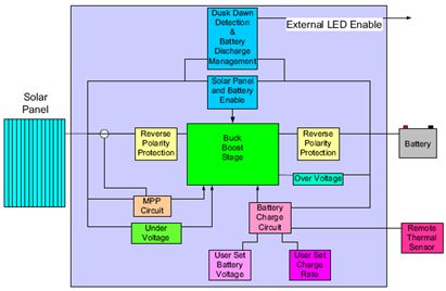 設(shè)計(jì)工作包括根據(jù)功率需求的增加隔離拓?fù)浣Y(jié)構(gòu)。電池充電狀態(tài)的管理是由適當(dāng)?shù)某潆娝惴ㄍ瓿傻?。太?yáng)能電池板安裝技師可以選擇輸出電壓和電池充電速率。由于控制器要連接到太陽(yáng)能電池板,它必須具有最大功率點(diǎn)跟蹤,為最終客戶提供高價(jià)值。控制器有兩個(gè)正使能(Enable)電路,一個(gè)電路檢測(cè)黑夜時(shí)間,另一個(gè)檢測(cè)電池的充電狀態(tài),使外部電路不會(huì)使電池對(duì)損壞點(diǎn)放電。由于控制器將由不同程度經(jīng)驗(yàn)的現(xiàn)場(chǎng)技術(shù)人員和新手安裝,因此重要的是輸入和輸出必須有反向極性保護(hù)。另外,控制器和電池可能安裝在過(guò)熱或過(guò)冷的位置,控制器必須采用電池充電溫度補(bǔ)償。設(shè)計(jì)還應(yīng)包括安全功能,如電池過(guò)壓檢測(cè)和太陽(yáng)能電池板欠壓檢測(cè)。