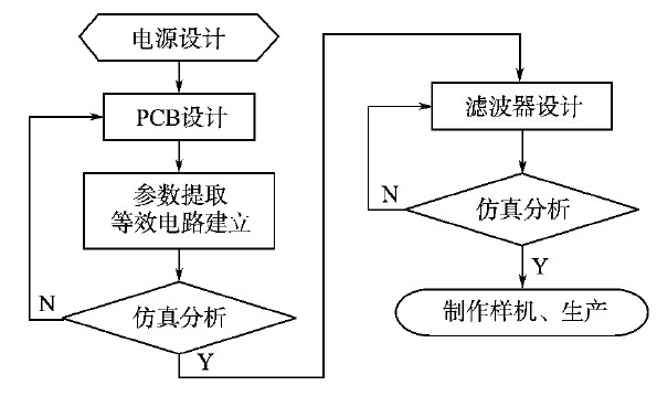 如果以上所有降低EMI的措施都完成了還沒有達到EMC的標(biāo)準(zhǔn),就可以根據(jù)前面仿真分析得到的差模和共模干擾的波形對濾波器進行設(shè)計。在設(shè)計濾波器的時候,也同樣要注意元件的布局,還有PCB寄生參數(shù)對濾波器阻抗的影響,其本質(zhì)也是增大對干擾的阻抗,使干擾無法通過傳播路徑。開關(guān)電源設(shè)計流程如圖5所示。