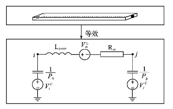 J.Ekman提出了基于寄生參數(shù)矩陣的等效電路的建立方法,即把所有互感、互容等效成受控的電壓源,與自感、自容連接(相當(dāng)于把所有互感、互容對電路的影響等效到受控電壓源上),從而建立等效電路模型。圖4所示為任意兩個節(jié)點間的等效電路模型。