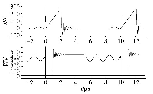 文獻基本都是用梯形波來表示噪聲源的,但實際中并不是每個電路中的開關(guān)器件的波形都能很好地用梯形波近似,圖3所示即為一個反激電源開關(guān)管的電流電壓波形,除了梯形波之外,還有電流尖峰,電壓過沖和下沖等分量,會導(dǎo)致噪聲源的頻譜與梯形波有一定的不同。所以不能盲目地使用梯形波來表征噪聲源,而是需要對電路進行分析或者仿真,從而得到開關(guān)器件的電流或電壓波形,基于此波形再對噪聲源進行建模,這樣才能更精確地反映開關(guān)電源的電磁干擾。