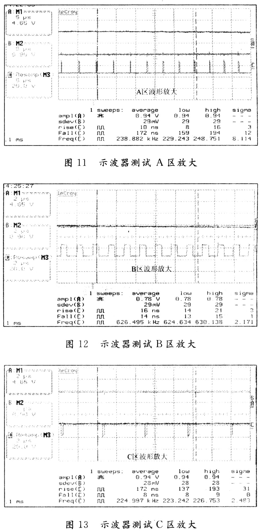 由圖10~圖13可知,輸入波形疊加有高頻雜波。說明前端引入不良干擾,需進(jìn)一步分析改進(jìn);輸出波形平滑,無交越失真,Deadtime特性較好;輸入/輸出正弦波相位相反,直接由電阻RA128等形成閉環(huán)負(fù)反饋通路,降低了噪聲干擾,并進(jìn)行增益控制。A,B,C區(qū)的拓展圖輸出正弦波峰、波谷、S區(qū)域處PWM的頻率分別為238.8 kHz,224.9 kHz,626.4 kHz,占空比不同,符合三角波采樣特性。圖中波峰、波谷處PWM脈沖fall下降沿和rise上升沿更為陡峭,相比S形區(qū)域,包含大量高頻諧波,易引起EMI輻射,但通過巴特沃思二階濾波器濾波后,輸出正弦波良好,無明顯高頻雜波迭加,EMC測試也無明顯對外輻射頻率,滿足了設(shè)計(jì)需要。