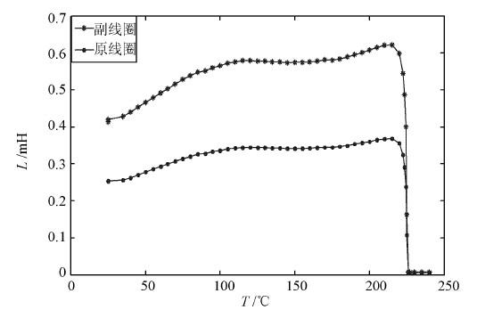 變壓器在中不僅能傳遞能量,同時(shí)還起到了電氣隔離的作用,變壓器的原邊與副邊線圈匝數(shù)比的不同可以達(dá)到升壓或降壓的作用。在模塊工作狀態(tài)下,由于磁芯的渦流效應(yīng),變壓器會(huì)產(chǎn)生很多的熱量,成為模塊熱量產(chǎn)生的主要來(lái)源。實(shí)驗(yàn)中首先測(cè)試了變壓器原邊和副邊線圈的電感量隨溫度的變化,如圖3 所示,從圖3 中可見(jiàn)隨著溫度的升高,線圈的電感量先增加,然后小幅下降,再小幅上升,在環(huán)境溫度為220℃ 以前,變壓器的原邊與副本電感量的整體趨勢(shì)是逐漸增加,當(dāng)溫度達(dá)到220℃,磁芯溫度達(dá)到居里點(diǎn),線圈的電感量迅速降為零。對(duì)于不同磁芯材料的變壓器其居里點(diǎn)溫度有所不同,對(duì)于此類變壓器,可知居里溫度在220℃附近。當(dāng)變壓器溫度接近居里點(diǎn)時(shí),變壓器電感量會(huì)迅速減小,會(huì)導(dǎo)致輸出電壓迅速下降。