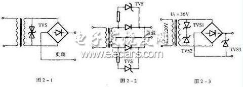 圖2-3所示電路中,單向TVS1和TVS2反接并聯(lián)于電源變壓器輸出端或選用一個雙向TVS,用以保護整流電路及負載中的元器件。