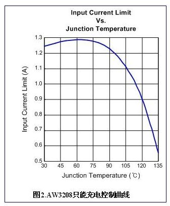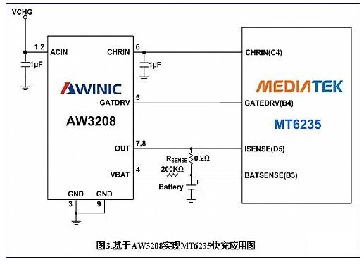 上海艾為電子專門(mén)針對(duì)MT6235/36平臺(tái)推出的AW3208在增加OVP功能的同時(shí),提供了智能充電功能,以滿足快速充電的功能。如圖2所示,AW3208內(nèi)置專有的K-ChargeTM技術(shù),可根據(jù)芯片溫度智能調(diào)整輸出電流,以保證在充電期間整個(gè)充電系統(tǒng)的安全。使得手機(jī)在實(shí)現(xiàn)快速充電的時(shí)候不會(huì)因?yàn)橛捎诃h(huán)境溫度較高或者充電電流過(guò)大導(dǎo)致芯片進(jìn)入過(guò)溫保護(hù)使得充電沒(méi)法正常進(jìn)行。圖3為在MT6235上的典型應(yīng)用圖。