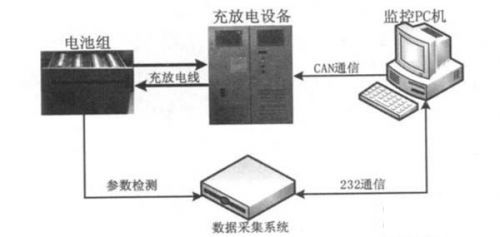 測試平臺的結(jié)構(gòu)如圖1所示,以單片機(jī)為核心的電池?cái)?shù)據(jù)采集系統(tǒng)直接對電池組的單體電壓、總電壓、溫度、電流、充放電容量、充放電能量等信息進(jìn)行精確測量,并通過RS232總線將數(shù)據(jù)發(fā)送到上位機(jī)。由微型計(jì)算機(jī)構(gòu)成的上位機(jī)監(jiān)控系統(tǒng), 實(shí)時顯示并記錄接收到的測試數(shù)據(jù), 對數(shù)據(jù)進(jìn)行分析,監(jiān)控測試系統(tǒng)工作狀態(tài)。另外可根據(jù)具體的實(shí)驗(yàn)要求,控制充放電設(shè)備按照編程指令輸出電流,模擬電池在某些特定條件下的使用情況。充放電設(shè)備實(shí)現(xiàn)電池組的充放電, 完成電池和電網(wǎng)之間能量的雙向流動, 與監(jiān)控PC 機(jī)通過CAN 通信, 可接收監(jiān)控PC機(jī)的編程控制指令。文中主要完成數(shù)據(jù)采集系統(tǒng)、上位機(jī)監(jiān)控系統(tǒng)的設(shè)計(jì)并實(shí)現(xiàn)各部分之間的實(shí)時通訊。