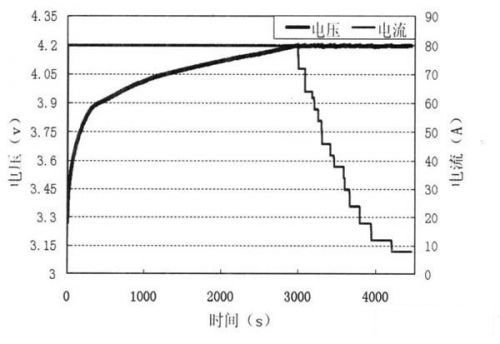 為了測試該系統(tǒng), 使用3. 7V /80Ah的錳酸鋰電池做恒流恒壓充電試驗(yàn)。在上位機(jī)程序中設(shè)置如下參數(shù): 恒流階段充電電流80A, 充電截止電壓4. 2V,恒壓階段截止電流0. 1A, 得到的充電曲線如圖4所示。