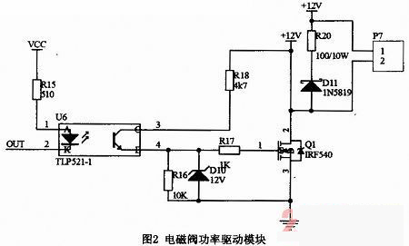 圖2所示的是電磁閥功率驅(qū)動(dòng)模塊。其中,P7插座連接高速電磁閥,電磁閥線圈一端連接電源,另一端連接場(chǎng)效應(yīng)管漏極。Q1是場(chǎng)效應(yīng)管IRF540,起放大作用。U6是可控制的光電耦合器件TLP521-1,它廣泛應(yīng)用于電路之間的信號(hào)傳輸,將ECU與負(fù)載隔離,可以增加電路的安全性,減小電路干擾,簡(jiǎn)化電路設(shè)計(jì)。當(dāng)ECU發(fā)出驅(qū)動(dòng)信號(hào),光耦導(dǎo)通,穩(wěn)壓二極管D10將場(chǎng)效應(yīng)管Q1的柵極電壓穩(wěn)定在12V,漏極電流增大,漏極電壓被拉低。此時(shí),電磁閥線圈電流增大,線圈產(chǎn)生強(qiáng)大的電動(dòng)勢(shì),電磁閥被打開(kāi)。而當(dāng)光耦截止時(shí),電磁閥關(guān)閉,線圈中電路變化很大,會(huì)產(chǎn)生反電動(dòng)勢(shì)。R20功率電阻和D11肖特基二極管IN5819與電磁閥并聯(lián),防止場(chǎng)效應(yīng)管被擊穿。