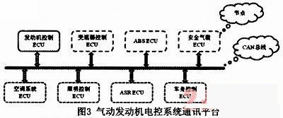 氣動(dòng)發(fā)動(dòng)機(jī)的控制系統(tǒng)是極其復(fù)雜的,不僅包括轉(zhuǎn)速、油門(mén)位置等信號(hào)的采集處理;還要對(duì)電磁閥的噴氣定時(shí)和噴氣量完成精確控制等等。另外,氣動(dòng)汽車上還包括ABS、空調(diào)系統(tǒng)和車輛燈光等模塊,這些模塊需要實(shí)時(shí)共享車輛的數(shù)據(jù),以達(dá)到整車的最優(yōu)控制。傳統(tǒng)的電氣控制設(shè)計(jì)策略已經(jīng)不能滿足當(dāng)今電氣控制網(wǎng)絡(luò)的需要,而CAN總線的數(shù)據(jù)通訊具有突出的可靠性、實(shí)用性和靈活性等特點(diǎn)。氣動(dòng)發(fā)動(dòng)機(jī)電控系統(tǒng)通訊平臺(tái)如圖3所示。它具有布線成本低、通訊速率高和數(shù)據(jù)傳輸精度高等優(yōu)勢(shì)。