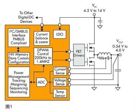 一個(gè)應(yīng)用建議是把DC-DC轉(zhuǎn)換器盡可能靠近負(fù)載放置。這樣做可以把EMI降至最低、減小寬的大電流線跡所占用的板空間,并改進(jìn)轉(zhuǎn)換器的動(dòng)態(tài)特性。“分布式”功率管理系統(tǒng)應(yīng)運(yùn)而生,在這種系統(tǒng)中,所有轉(zhuǎn)換器都理想地彼此相連。能夠與其它轉(zhuǎn)換器在網(wǎng)絡(luò)中協(xié)同工作的一個(gè)控制器例子是FD2004,如圖1的模塊示意圖所示。