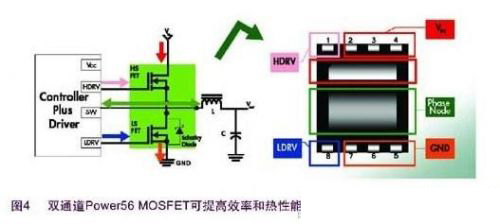 1.帶驅(qū)動(dòng)器和MOSFET的分立式解決方案現(xiàn)在仍在普遍使用。為滿足所有設(shè)計(jì)要求,現(xiàn)在飛兆半導(dǎo)體提供的采用小尺寸熱性能增強(qiáng)型MLP(QFN)封裝的產(chǎn)品,可獲得高系統(tǒng)性能。MOSFET實(shí)現(xiàn)了首先采用MLP封裝(見圖3所示)。其Power56和Power33產(chǎn)品系列采用最新的PowerTrench技術(shù),能夠同時(shí)提供超低RDSon和低Qg,從而適用于高開關(guān)頻率應(yīng)用。鍵合技術(shù)可減小封裝的電感,提高封裝有限的ID,適用于大電流應(yīng)用。其低端FET產(chǎn)品組合采用SyncFET集成了肖特基二極管,在實(shí)現(xiàn)高開關(guān)性能的同時(shí)降低了熱耗。