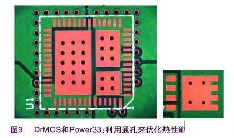 至于版圖布局,金屬較多顯然很有助益。更厚的頂層有助于降低溫度,不過也許對(duì)PCB的其余部分并不適合,因?yàn)槌杀驹黾恿耍渌枰母?xì)的間距也不可能實(shí)現(xiàn)。更大的銅面積很有用,但又會(huì)消耗PCB空間。這些應(yīng)該盡可能由焊料覆蓋,因?yàn)榻饘俦砻姹韧科岜砻娴纳嵝愿?。在多層PCB中,有時(shí)利用內(nèi)層來協(xié)助散熱。熱通孔(填充焊料)有時(shí)可用來把熱量擴(kuò)散到PCB的另一面去(圖9)。