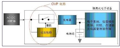 根據(jù)YD/T 1591-2006標準,手機側(cè)充電控制電路應具備過壓保護裝置,也就是在手機充電接口導入直流6 V以上電壓時,如果不能保證安全充電,應啟動保護,在非預期電壓的情況下,不應出現(xiàn)過熱、燃燒、爆炸以及其它電路損壞的現(xiàn)象,而且恢復后,手機應能正常工作。如圖4所示,過壓保護(OVP)電路在檢測到過壓故障狀況時,檢測電路就會將開關(guān)打開,使電子負載與電源斷開,從而使得包括微處理器、射頻、存儲器和電源管理器件等核心芯片遭受過壓損傷。