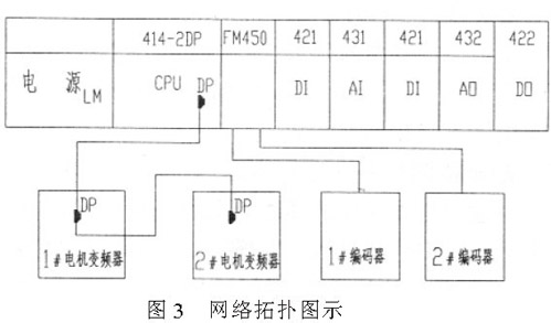 采用PLC 與變頻器控制方法, 實(shí)現(xiàn)多個分散驅(qū)動電機(jī)同步運(yùn)行。PLC 采用西門子S7400 系列, 圖3為網(wǎng)絡(luò)拓?fù)鋱D。