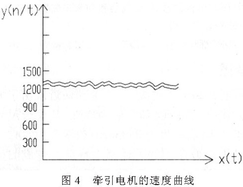 利用 STEP7 編制PLC 上位機(jī)監(jiān)控程序,Wincc采集速度值并繪制曲線。數(shù)據(jù)提取的時(shí)間間隔為15ms。實(shí)際上牽引電機(jī)1 和牽引電機(jī)2 速度是相同的, 但為了反映牽引電機(jī)2 的跟蹤和波動情況, 在此特地將其分開, 上面是牽引電機(jī)1 的速度曲線, 下面是牽引電機(jī)2 的速度曲線(見圖4) 。牽引電機(jī)1 的速度發(fā)生變化時(shí), 牽引電機(jī)2 就能及時(shí)地響應(yīng), 進(jìn)行跟蹤, 并且能很快地達(dá)到穩(wěn)定。實(shí)驗(yàn)表明, 采用PLC 和變頻器的控制方法, 能達(dá)到較高的同步要求, 響應(yīng)快、速度波動幅度較小。