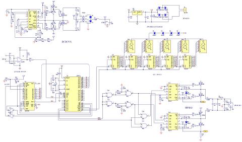 本系統(tǒng)設(shè)計(jì)的交流穩(wěn)壓電源的原理圖如圖6 所示,原理圖中包括了單片機(jī)最小系統(tǒng)設(shè)計(jì)、DC-DC升壓電路、SPWM轉(zhuǎn)換電路、H 橋驅(qū)動(dòng)電路及頻率的采樣和顯示電路。