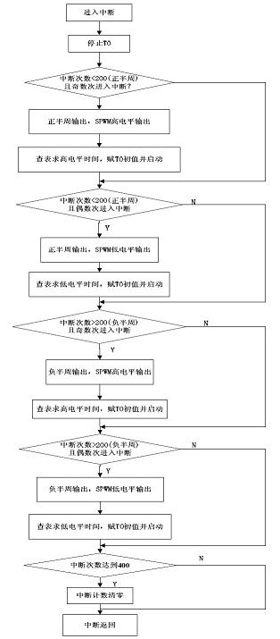 本設(shè)計(jì)采用定時(shí)/計(jì)數(shù)器0 來(lái)完成SPWM 波形的產(chǎn)生,工作模式設(shè)定為模式1。軟件流程圖如圖8所示。