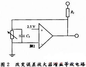 變壓器+15 V,-9 v/0.2 A一路輸出電壓通過TL431a和光耦PC817反饋到UC3845的1腳,UC3845的2腳接地,UC3845內(nèi)部誤差比較放大器的輸入誤差總是固定的,將PC817的光電晶體管視為可變電阻,1腳的反饋信號改變的是誤差比較放大器的增益,其等效電路如圖2所示。