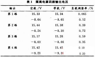 對設(shè)計的電路進行實驗,得出了實驗數(shù)據(jù)和波形。表1為隔離電源在空載和帶載(+15 V,-9 V/0.2 A一路輸出帶載240 Ω,另外3路輸出各帶載120 Ω)下的4路輸出電壓值及相應(yīng)的負載調(diào)整率。