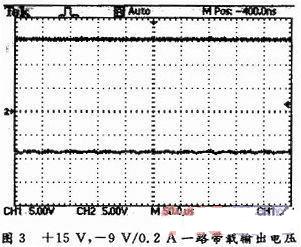 圖3為+15 V,-9 V/0.2 A一路輸出帶載時的電壓波形。圖3為+15 V,-9 V/0.2 A一路帶載輸出電壓:深色CH1為+15 V輸出,淺色CH2為-9 V輸出。