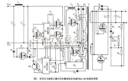 圖 3所 示 為采用交叉級聯(lián)正激變換電路設(shè)計的通信設(shè)備專用DC-DC半磚電源原理圖。工作原理如下,R,, R2. D,, Q,, D:和C:組成自舉啟動電路,得到啟動電壓Vc分別給ICI,I C2和IC3供電。電路啟動后,T,的輔助繞組經(jīng)D3整流,C3平滑濾波后為IC提供電壓VD,因VD電壓高于Vc,二極管D2反偏,Q、的供電關(guān)閉,達到啟動電路無功耗的目的。IC:的腳6輸出方波信號,一路直接送到ICl的腳5,另一路經(jīng)Q2倒相后送到IC:的腳6作為IC,的輸入信號。IC,的腳3和腳8輸出相位相差180“的方波脈沖信號,分別驅(qū)動MOSFETQ 31 Q 4- Q3" Q 4" L 2等組成高效率的同步降壓級,降壓級的占空比保持在30-60%. IC3.Qs"Q6"T.等組成交叉級聯(lián)正激式隔離級,達到DC-DC最終的輸出電壓。馬、DS為變壓器T,的磁復(fù)位繞組。由于降壓級已將變化范圍較寬的輸入電壓嚴密調(diào)整為中間總線電壓,因此隔離級不需調(diào)壓。交叉級聯(lián)正激變換器都工作在50%的占空比,可以采用VDS為100V的MOSFET. Q7, Q:等組成自偏置式同步整流電路,因隔離級的輸出電壓是固定的,所以同步整流MOSFET漏極的輸入電壓也是固定的,占空比也為50%,可以使用VDS很低的MOSFET(本例中采用的是VDS為12V的MOSFET,損耗最低)因功耗引起的發(fā)熱問題均可以方便解決。因輸入電壓固定,多出電壓時,能夠方便地實現(xiàn)高電壓調(diào)整率和高負載調(diào)整率,單級變換器很難做到此點。其他電路功能(如過流、過壓、過溫度保護等)不再一一闡述。經(jīng)測量該電路的工作效率約在92%左右,達到預(yù)定的設(shè)計要求,并且調(diào)試較簡單,為今后的批量生產(chǎn)奠定了基礎(chǔ)。