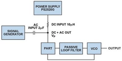 電荷泵的低功耗使其看似頗具吸引力,可使用升壓轉(zhuǎn)換器從較低的電源電壓產(chǎn)生高電荷泵電壓,然而與此類DC-DC轉(zhuǎn)換器相關(guān)的開關(guān)頻率紋波可能在VCO的輸出端產(chǎn)生干擾雜散音。高PLL雜散可能造成發(fā)射機(jī)發(fā)射屏蔽測(cè)試失敗,或者降低接收機(jī)系統(tǒng)內(nèi)的靈敏度和帶外阻塞性能。為幫助指導(dǎo)轉(zhuǎn)換器紋波的規(guī)格,使用圖6的測(cè)量設(shè)置針對(duì)各種PLL環(huán)路帶寬獲得全面電源抑制曲線圖與頻率的關(guān)系。