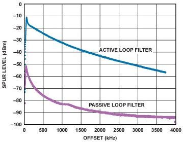 電荷泵將鑒相器誤差電壓轉(zhuǎn)換為電流脈沖,并通過PLL環(huán)路濾波器進(jìn)行積分和平滑處理。電荷泵通??稍谧疃嗟陀谄潆娫措妷海╒P)0.5 V的電壓下工作。例如,如果最大電荷泵電源為5.5 V,那么電荷泵只能在最高5 V輸出電壓下工作。如果VCO需要更高的調(diào)諧電壓,則通常需要有源濾波器。有關(guān)實(shí)際PLL的有用信息和參考設(shè)計(jì),請(qǐng)參見電路筆記CN-0174,5,處理高壓的方式請(qǐng)參見利用高壓VCO設(shè)計(jì)高性能鎖相環(huán),"6該文章發(fā)表于模擬對(duì)話第43卷第4期(2009)。有源濾波器的替代方案是使用PLL和針對(duì)更高電壓設(shè)計(jì)的電荷泵,例如ADF4150HV ADF4150HV可使用高達(dá)30 V的電荷泵電壓工作,從而在許多情況中省去了有源濾波器。