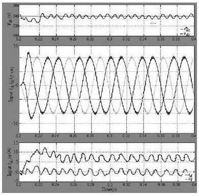 在正常工作條件下, 穩(wěn)壓器輸出穩(wěn)定的直流母線電壓和d 軸電流控制, 但是逆變器負荷不均衡, 就會產生波動的直流電壓, 因此整流器在不平衡負載下會造成前端總諧波失真( THD) 的輸入電流。