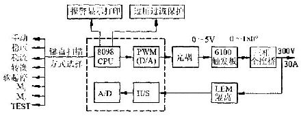 系統(tǒng)工作在開環(huán)狀態(tài),利用8098的PWM口,經(jīng)濾波后輸出一個0~5V的控制電壓信號給觸發(fā)板,使整流橋相應(yīng)輸出電壓為0~300V.該方式主要用于系統(tǒng)主電路的檢修和維護。