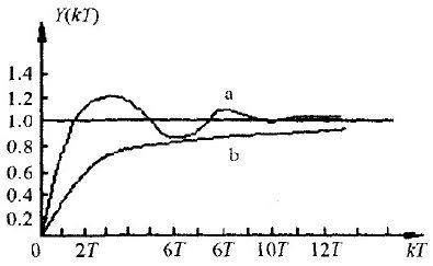 恒偏差法和有效偏差法相類似。有效偏差法又叫逆算法。即當(dāng)控制量Uk越限時,Uk取邊界值Umax或Umin.由該邊界值逆算出偏差值Ek''代替原來的偏差值Ek.然而,在恒偏差法中,是用經(jīng)過衰減后的Ek''去代替Ek.系統(tǒng)在階躍響應(yīng)時,實際工作在過阻尼狀態(tài),從而減緩了在起、停時對主電路器件的沖擊。圖3示出兩種算法的階躍輸入響應(yīng)曲線。其中曲線(a)標(biāo)準(zhǔn)PI算法響應(yīng)曲線、曲線(b)恒偏差法響應(yīng)曲線。