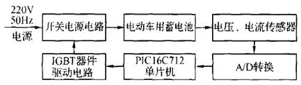 目前,電動車電池作為一種儲能裝置,主要以鉛酸蓄電池為主,充電器是專門針對鉛酸蓄電池所設(shè)計的。傳統(tǒng)的蓄電池充電器采用電流/電壓負反饋的方法來達到恒流/恒壓充電的目的,為了實現(xiàn)充電過程各種工作參量的實時監(jiān)測及智能多段式充電策略的精確控制,引入電流/電壓反饋環(huán),應(yīng)用P IC16C712 單片機及相應(yīng)的控制電路,其硬件結(jié)構(gòu)框圖如圖1所示,電路圖如圖2所示。