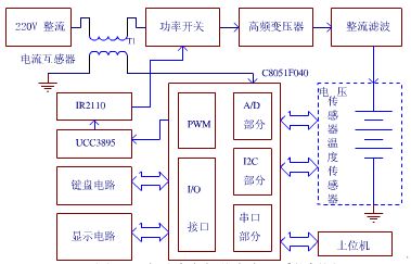 該方案中開關(guān)電源的最大輸出功率為2.6KW,交流輸入范圍為l70V-270V,充電器電路主要包括主充電電路和單片機(jī)控制電路兩部分,整個(gè)電路的工作過程為:220v單相交流電經(jīng)過全橋整流由電容進(jìn)行濾波.得到約300v左右的直流電.經(jīng)過由4只IGBT構(gòu)成的逆變橋,得到高頻交流電,經(jīng)高頻變壓器耦合到副邊.再經(jīng)過整流管D6,D7整流。最后經(jīng)過電感L3和電容C7濾波后得到穩(wěn)定的直流輸出。由于采用智能充電,根據(jù)不同的電池每個(gè)階段充電電壓和充電電流都不同。所以使用cygnal公司的C8051040F單片機(jī)作為充電過程控制設(shè)備,充電時(shí)單片機(jī)檢測充電電池的充電電流,充電電壓,電池溫度,防止電路過壓和過流。電池溫度過高,還可以通過檢測電池電壓電流值來決定是否在切換到下一個(gè)的充電階段。同時(shí)通過單片機(jī)給出每一階段的充電的電壓值或是電流值,與采樣所得的對應(yīng)電壓電流值相比較。通過移相控制芯片uCC3895改變PWM值來改變功率管的導(dǎo)通時(shí)間.達(dá)到在不同電池不同階段得到不同穩(wěn)定的輸出值的目的。