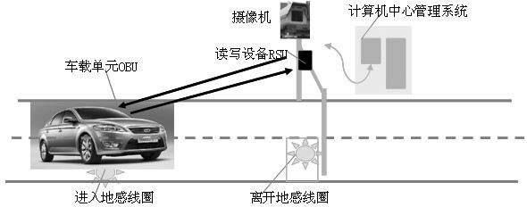 OBU 中存有車(chē)輛的識(shí)別信息,如車(chē)牌號(hào)、汽車(chē)ID號(hào),一般安裝于車(chē)輛前面的擋風(fēng)玻璃上,RSU安裝于收費(fèi)站旁邊,環(huán)路感應(yīng)器安裝于車(chē)道地面下。中心管理系統(tǒng)有大型的數(shù)據(jù)庫(kù),存儲(chǔ)大量注冊(cè)車(chē)輛和用戶的信息。當(dāng)車(chē)輛通過(guò)收費(fèi)站口時(shí),環(huán)路感應(yīng)器感知車(chē)輛,路邊單元發(fā)出詢問(wèn)信號(hào),車(chē)載單元做出響應(yīng)。并進(jìn)行雙向通信和數(shù)據(jù)交換,中心管理系統(tǒng)獲取車(chē)輛識(shí)別、車(chē)型等信息并和數(shù)據(jù)庫(kù)中相應(yīng)信息進(jìn)行比較判斷,根據(jù)不同情況來(lái)控制管理系統(tǒng)產(chǎn)生不同的動(dòng)作。通過(guò)路邊單元與車(chē)載單元進(jìn)行相互通信和信息交換,以達(dá)到對(duì)車(chē)輛的自動(dòng)識(shí)別,并自動(dòng)從該用戶的專(zhuān)用帳戶中扣除通行費(fèi),從而實(shí)現(xiàn)自動(dòng)收費(fèi)。